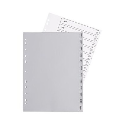 Em polipropileno resistente são ideais para manter os seus documentos A4 separados e organizados de acordo com os meses do ano – classificação Janeiro a Dezembro. Apresentam 11 furos, podendo ser usados em todo o tipo de pasta A4.