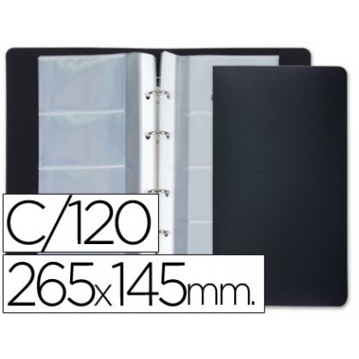 Porta cartões de visita em polipropileno com ferragem metálica de 4 anéis. Contém 15 bolsas com 4 departamentos cada uma. Capacidade para 120 cartões. 8 departamentos por folha. Cor preta. Medidas: 265 x 145 mm.