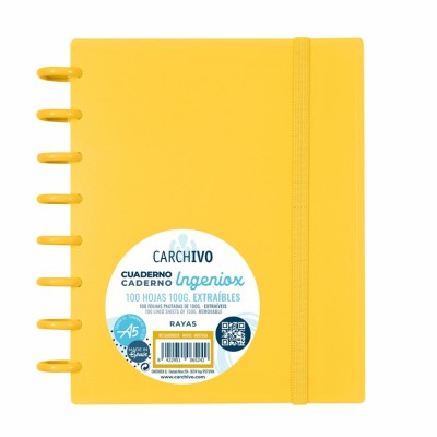 Caderno com sistema de encadernação com discos e folhas removíveis que permite fácil personalização e organização de anotações, anotações e planos de forma rápida e fácil.