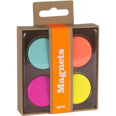 Ímans da linha Fluor Collection. Caixa de papelão Kraft. Cada caixa inclui 4 ímans em cores fluorescentes: fúcsia, amarelo, laranja e turquesa.