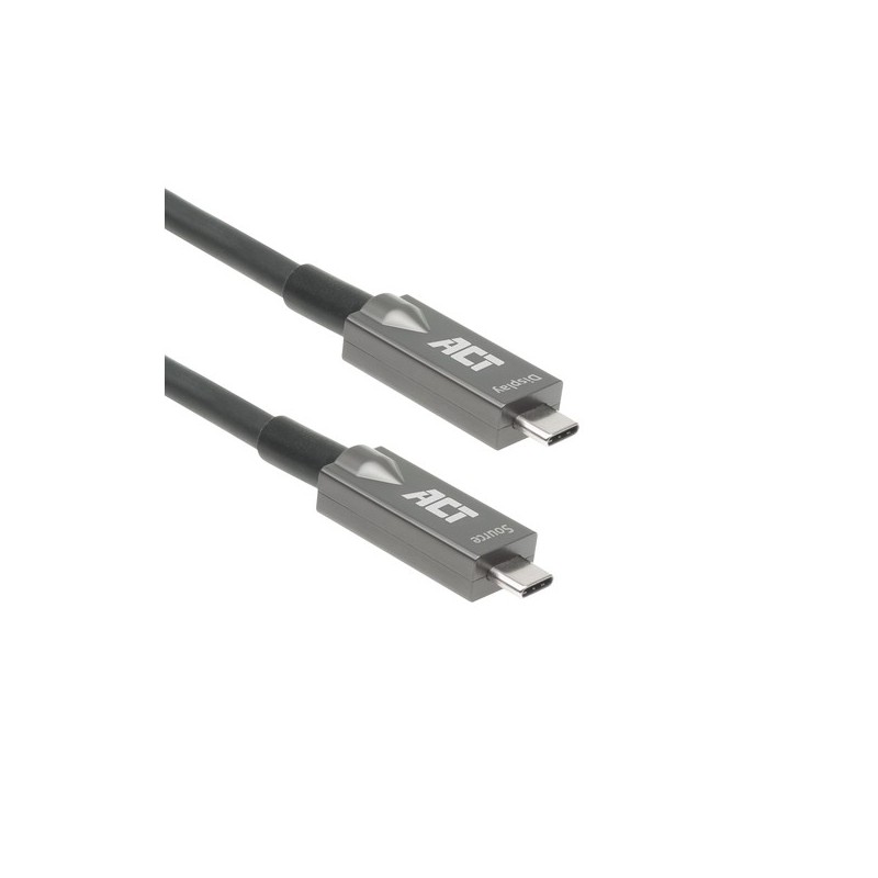, vídeo e energia em um cabo. Os cabos USB-C padrão têm um comprimento máximo de 2 metros. Com AOC, o comprimento máximo é de 10 metros sem perda de dados/vídeo/energia. Os cabos ópticos ativos USB-C ACT suportam USB 3.2 Gen2 para transferência de dados/vídeo de até 10 Gbps. O cabo USB-C AOC suporta Modo Alternativo de Exibição de até 4K a 60 Hz. Além disso, os cabos podem suportar 60 W de Fornecimento de Energia.