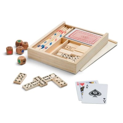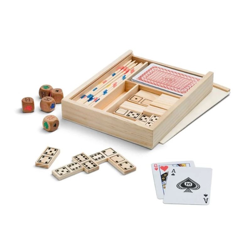 Conjunto de jogos para toda a família: 4 em 1. Caixa de madeira que inclui: dominó, mikado, um baralho de cartas e dados. 190 x 138 x 31 mm