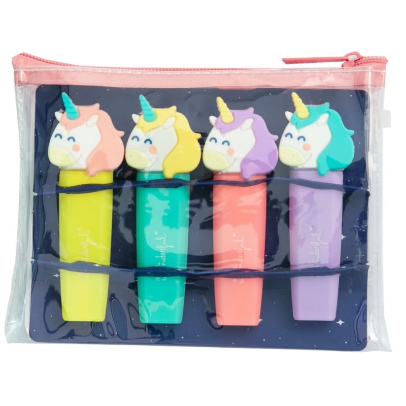 Um conjunto de três marcadores de texto em tons pastel com um unicórnio em cada ponta para um visual único. Também vêm em uma capa de TPU.