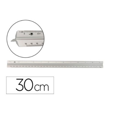 Escala fabricada em alumínio. Comprimento: 30 cm. Escalas 1:20/1:25/1:50/1:75/1:100 e 1:150. Com bolsa de plástico.