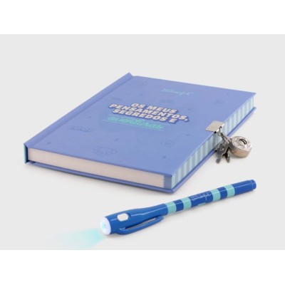 Diário pessoal com 224 páginas pautadas, carimbadas e datadas, com cadeado e chave (inclui chave extra). Além disso, inclui um recipiente com tinta azul normal de um lado e tinta "mágica" do outro: a tinta é invisível aos olhos e é iluminada pela luz incorporada no próprio recipiente.