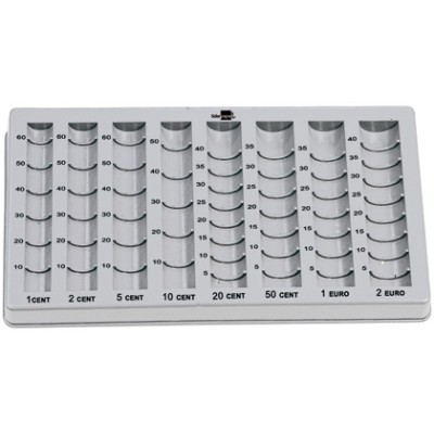 Fabricada em material plástico de grande resistência. Distribuida em 8 colunas com o valor de cada moeda gravada em relevo. Altura máxima: 38 mm. Altura mínima: 24 mm. Medidas: 155 x 28 mm
