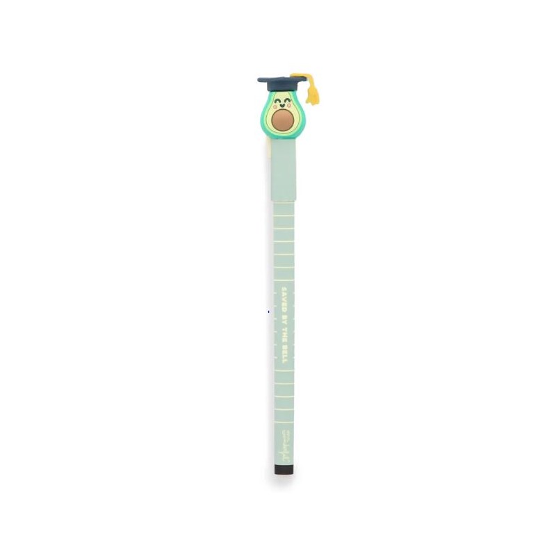 Caneta de tinta apagável com mensagem para os professores, com um abacate divertido numa das extremidades. Tinta preta.
