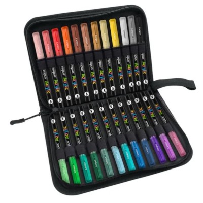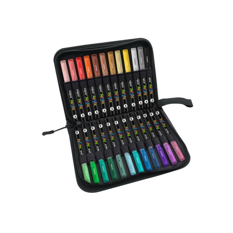 Marcadores de tinta acrílica. À base de água, opacos e de secagem rápida. Os marcadores em acrílico são versáteis para todos os tipos de trabalho. Todos os tipos de superfícies. Ponta em pincel. Basta agitar o marcador e escrever diretamente em qualquer superfície. Não exponha à luz solar direta ou a altas temperaturas. Feche bem após a utilização. Cores: verde-líquen, verde-claro, verde-escuro, azul-marinho, azul-pastel, castanho-claro, castanho-acinzentado, pele, coral, rosa-médio, ocre-claro, ocre-médio, branco, preto, amarelo, vermelho, laranja, verde-médio, azul-claro, azul-médio, violeta-escuro, violeta-claro, cinzento e verde-musgo. Estojo em tecido com fecho em 24 cores.