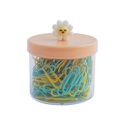 Pequeno pote de plástico transparente com 150 clipes de papel de metal e uma Wonder Daisy decorando a tampa.