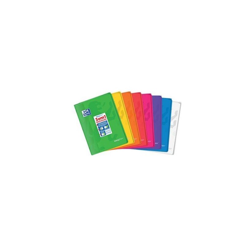 Caderno 3 em 1: Capa em plástico super-resistente com bolsa de fácil acesso no interior; Contracapa com 3 abas para guardar e transportar folhas soltas; Aba traseira ideal para usar como marcador de página; Papel de alta qualidade 90gr Optikpaper;