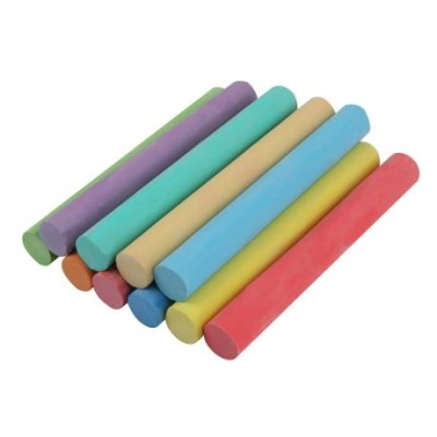 Caixa com 10 unidades de giz em diversas cores como vermelho, azul, verde, amarelo, entre outras.