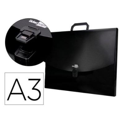 Fabricada em polipropileno. Com asa de plástico e fecho de mola, na cornpreta. Ideal para desenhos. Formato a3.
