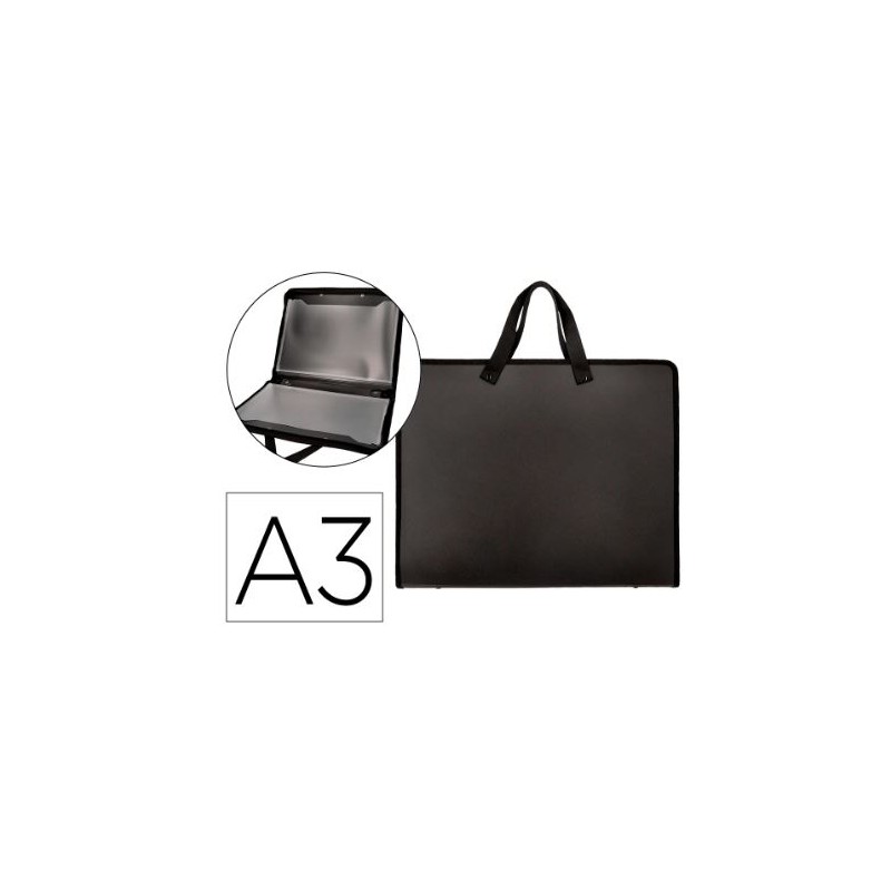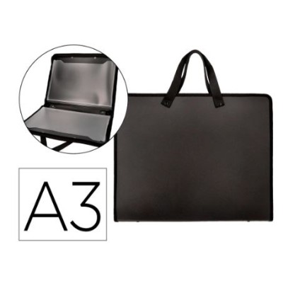 Fabricada em polipropileno. Com asas de tecido. Fecho de correr. 750 microns. 2 bolsos interiores de 200 microns. Ideal para desenho e design gráfico. Cor preta. Formato din a3.