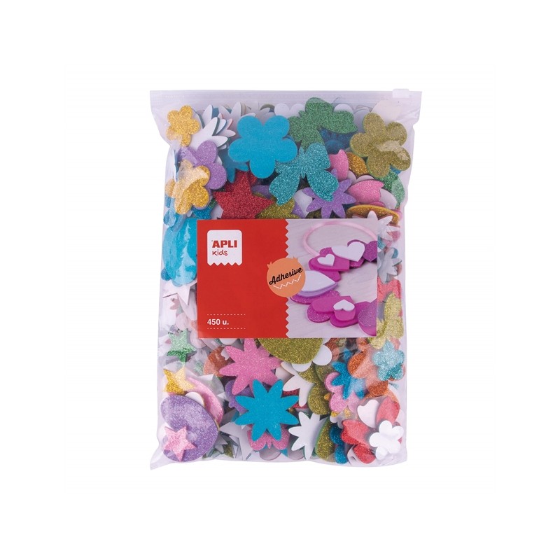 SACO C/ 450 x FORMAS GOMA EVA ADESIVA C/ PURPURINA TAMANHO E CORES SORTIDAS